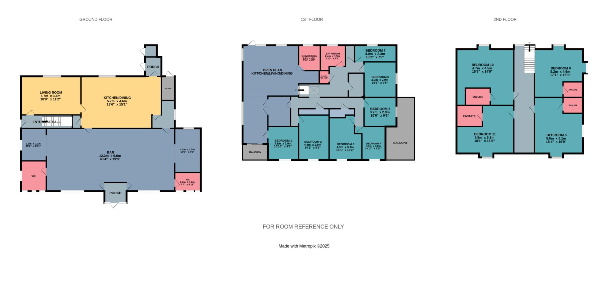 The first floor is arranged as a self-contained unit with access both internally and from an external staircase. An open plan kitchen, living and dining area with balcony forms the heart of this level. There are seven bedrooms in total, each with a wash hand basin, together with a bathroom and two shower rooms.